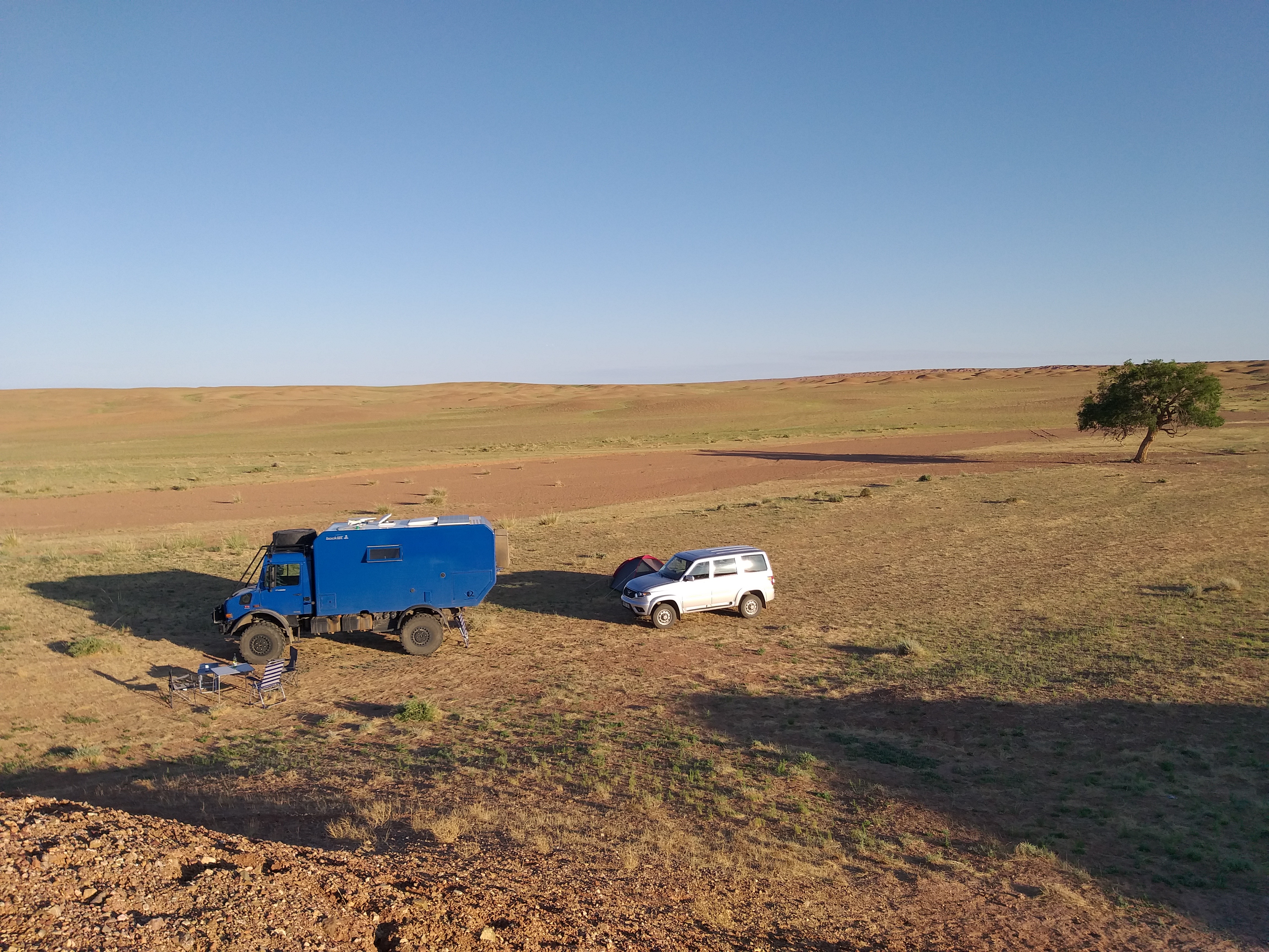 Por la noche buscamos una sitio para acampar fuera de la carretera. Por casualidad, nos encontramos con el único árbol dentro de un radio de estimados doscientos kilómetros: