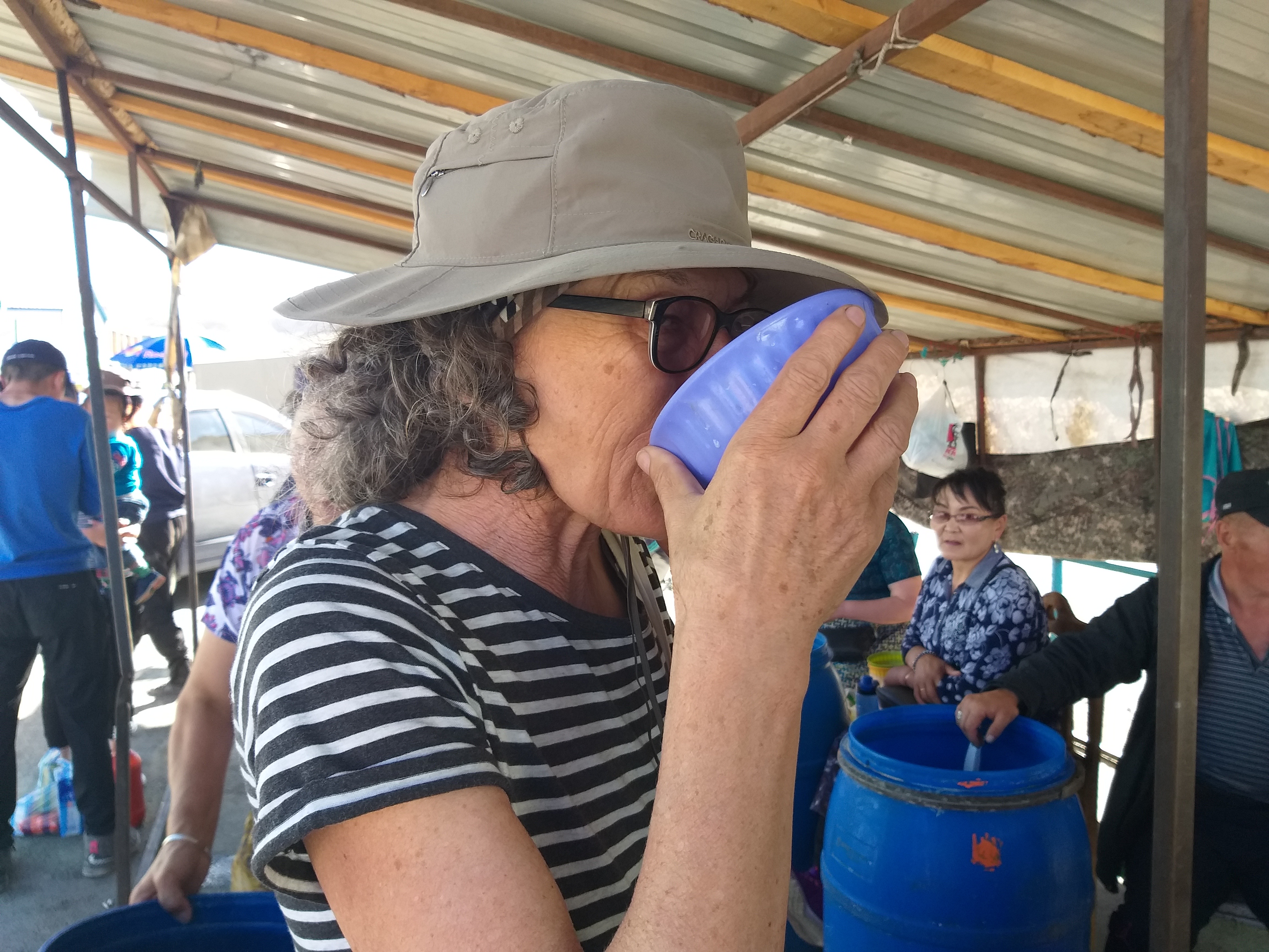 On the market in Charchorin Helga and Horst bravely take a sip of the popular drink: