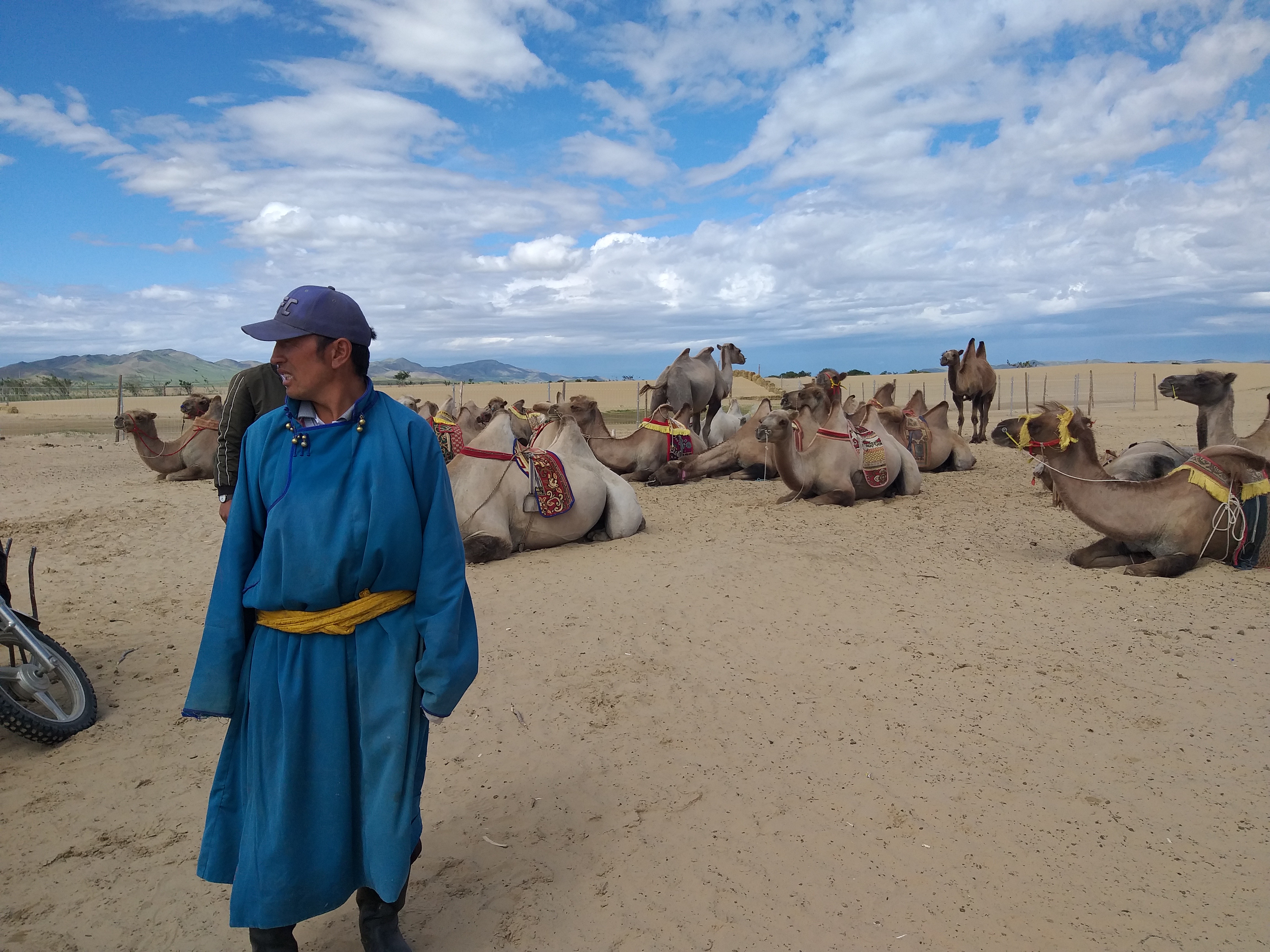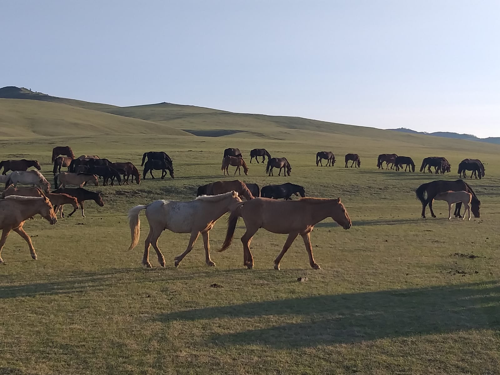 Una vez que vemos repentinamente al lado de la carretera muchos autos y camiones estacionados en medio de los terrenos. Numerosas personas, en su mayoría vestidas con trajes mongoles, corren con entusiasmo entre los vehículos. De repente, los caballos galopando aparecen en la cima de una colina y son esperados ansiosamente por las personas que esperan.