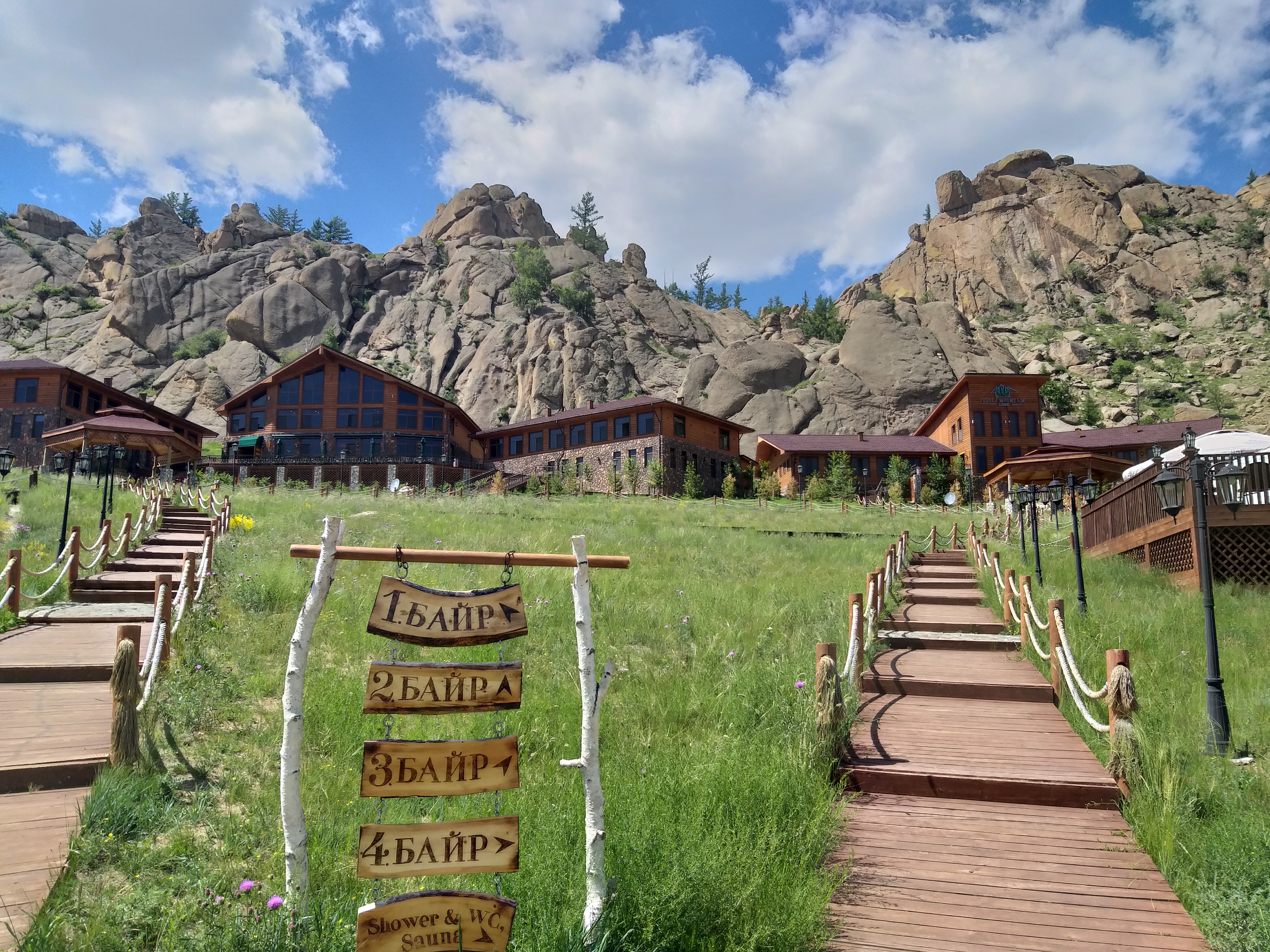 El Parque Nacional Terelj en el este de Ulan Bator es famoso por su belleza escénica y su proximidad a la capital. Para los residentes de Ulan Bator, este parque nacional se ha convertido en un área recreativa en los últimos veinte años, con una gran cantidad de campamentos de ger y algunos hoteles excelentes. Por ejemplo este, donde comemos dos veces muy bien: