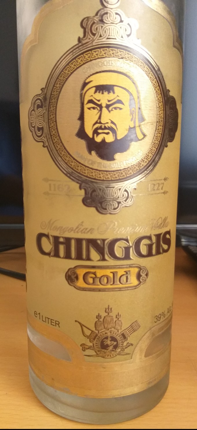 And so Genghis Khan is still revered in the country and is represented with his name and portraits on all imaginable products, not only on bills of 500 Tukrit (see above), but including on bottles of vodka: