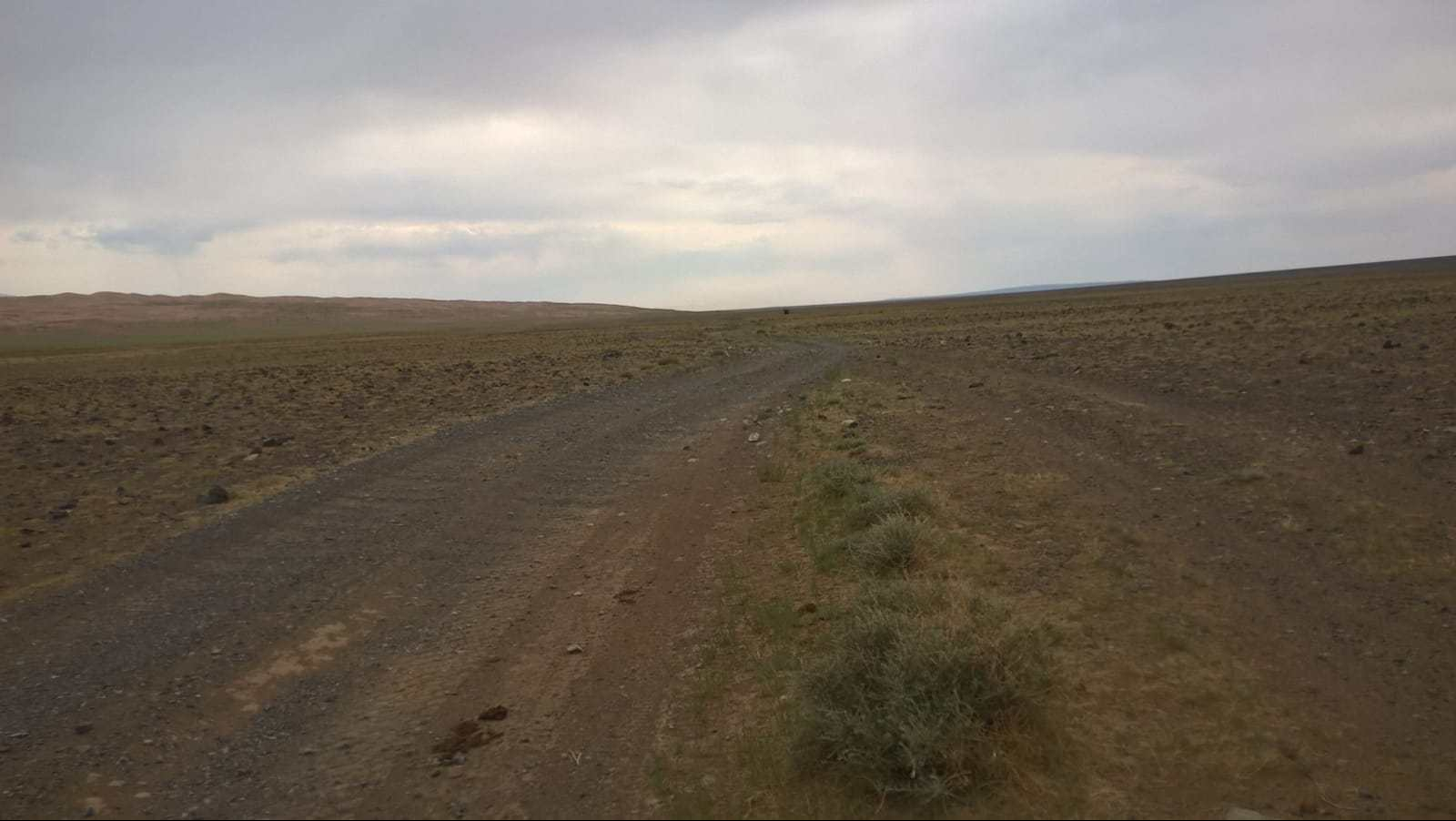 Ya en la larga pista hacia las dunas de arena, el clima empeora cada vez más. Está lloviendo (en el Gobi !!!) y sube un fuerte viento: