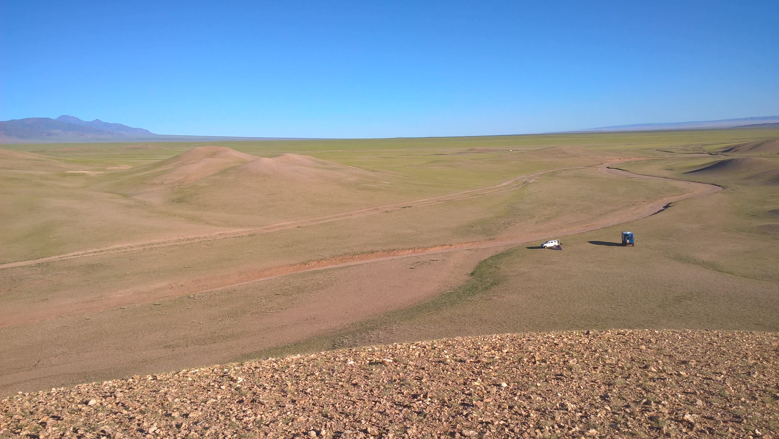 Salimos de la región rocosa de Baga Gazarin Chuluu y nos dirigimos al sur hacia el desierto de Gobi. La pista de regreso a la pista principal es de nuevo bastante exigente y agotadora:
