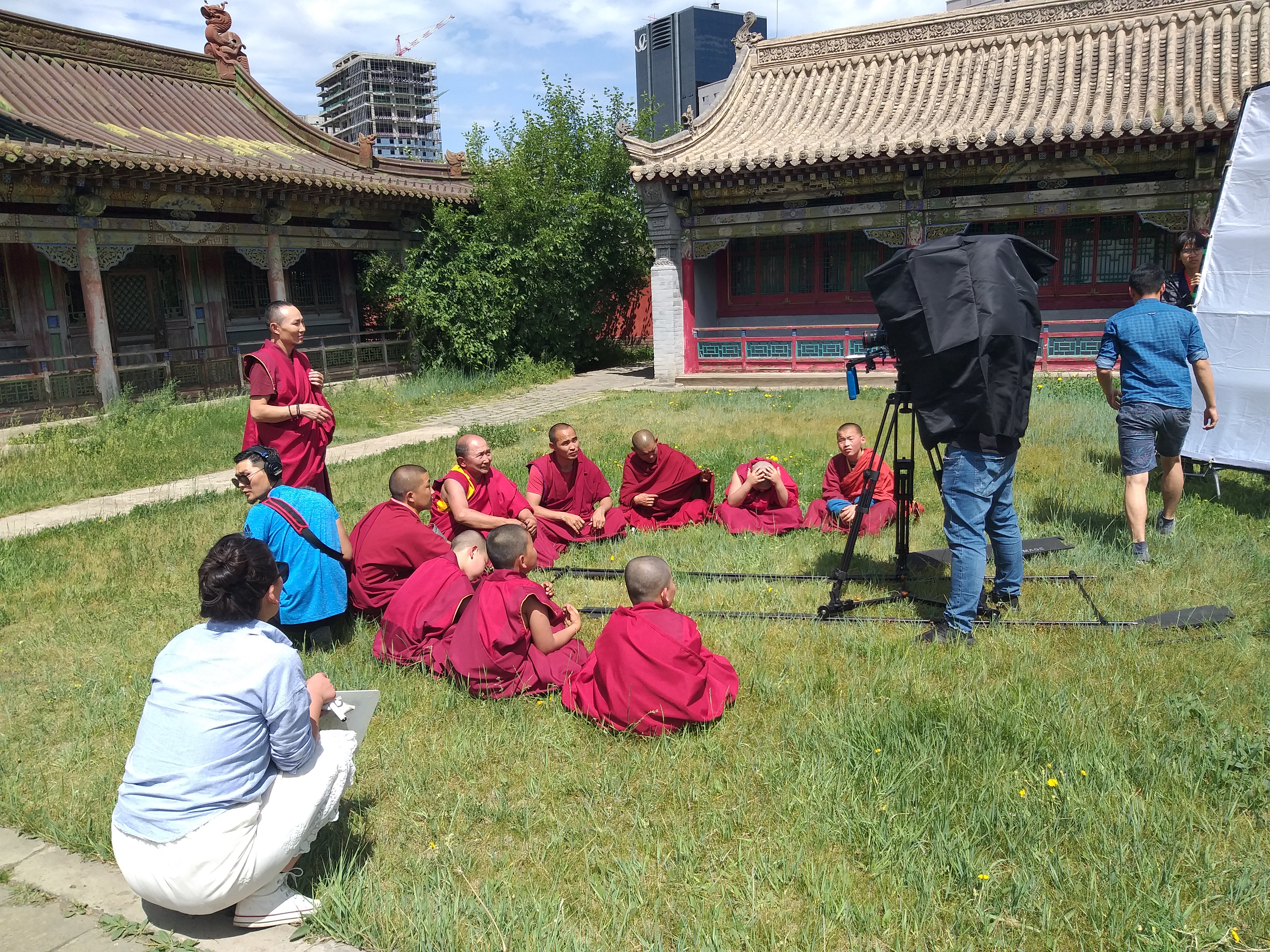 En uno de los patios están rodeando una película; los monjes son „verdaderos actores“ – como me expliqua el director mísmo: